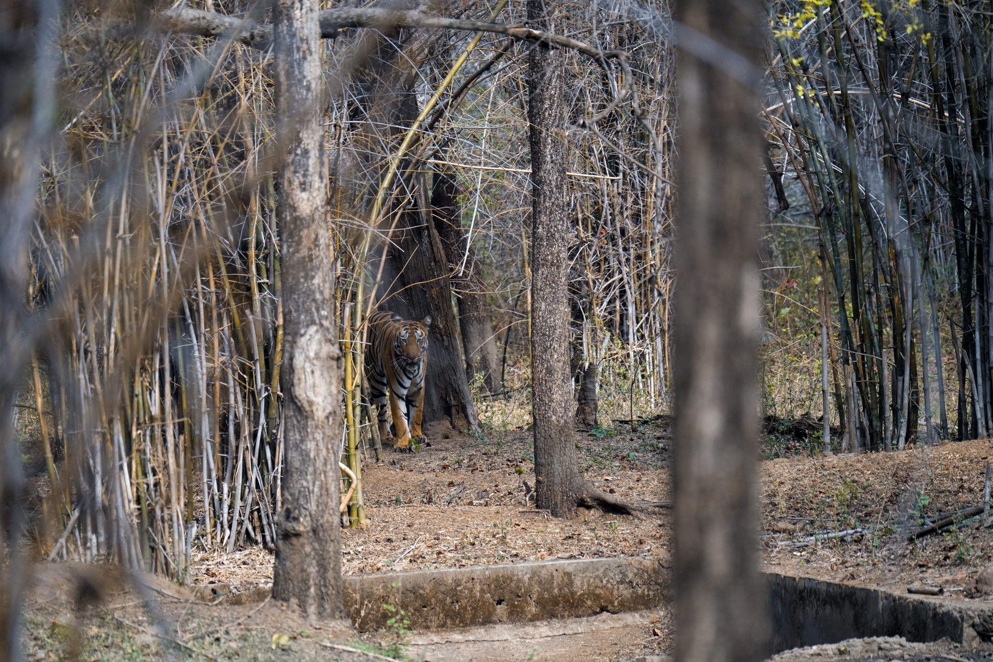 Description: A tiger enters the corridor of bamboo trees.