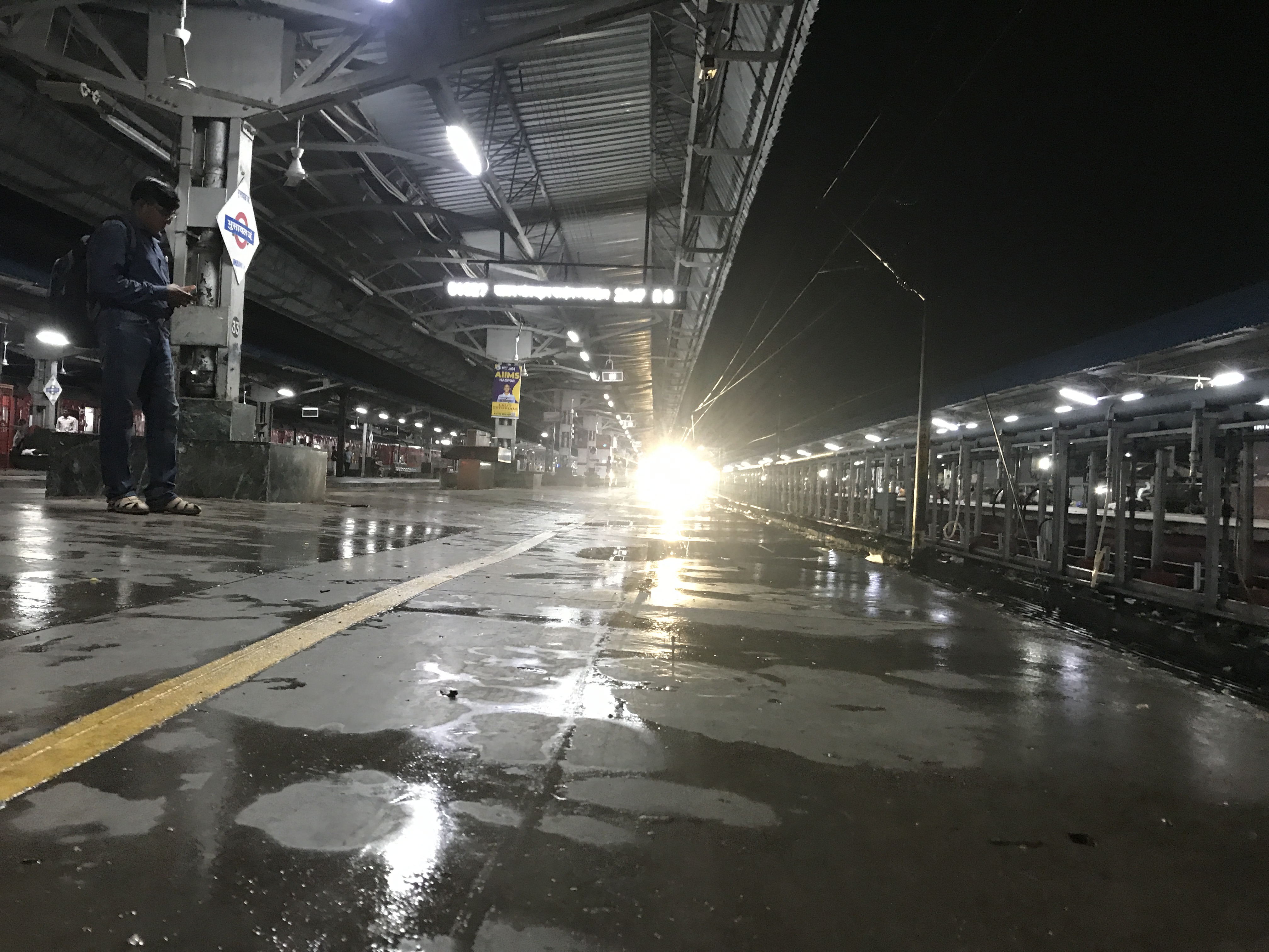 Description: The arrival of a train during wee hours on a station in India